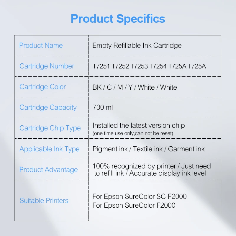 6Colors/Set T7251-T7254 T725A Compatible Ink Cartridge Filled With Garment Ink For Epson SureColor SC-F2000 F2000 F2100 600ML/PC : Click Here